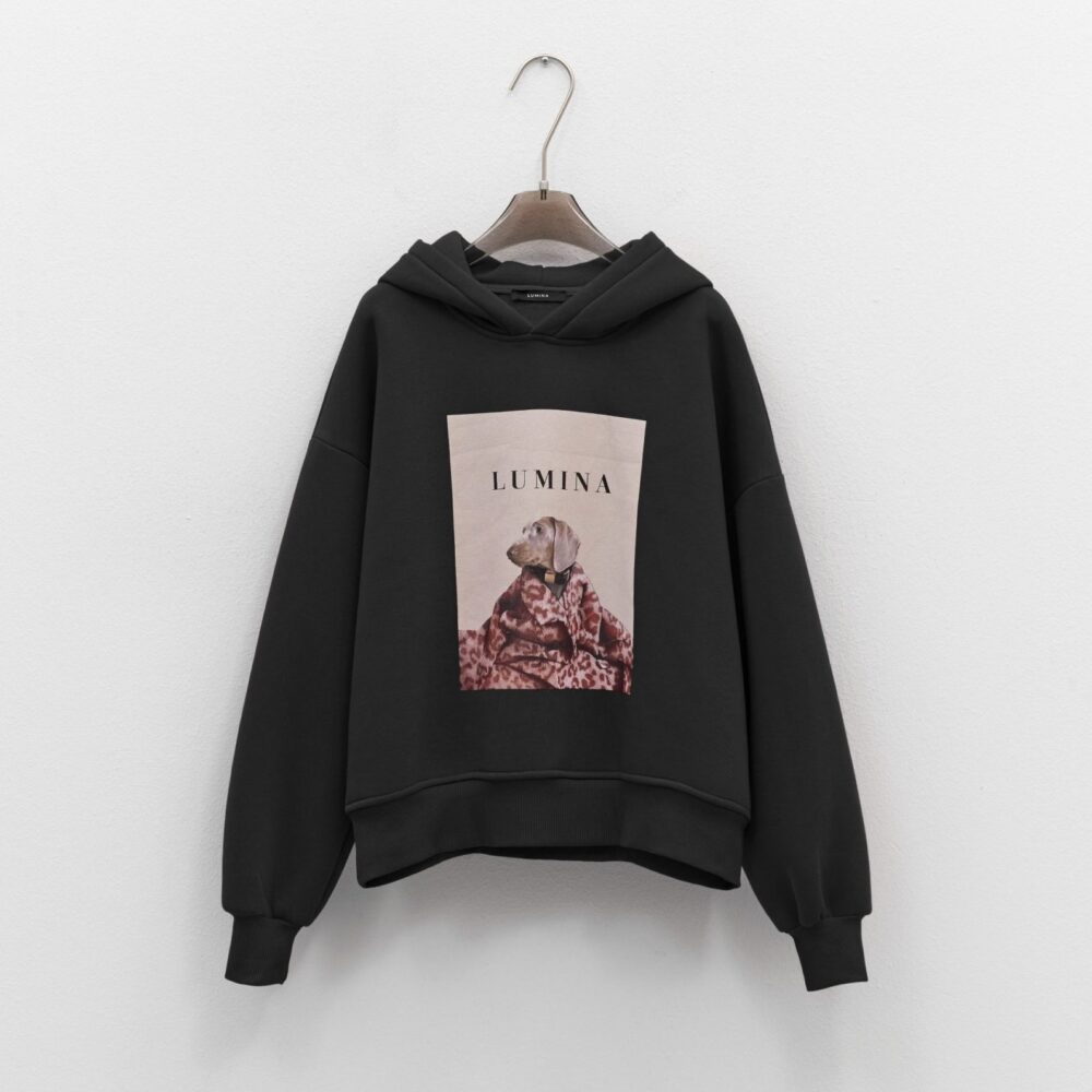 Γυναικείο φούτερ με κουκούλα σε μαύρη απόχρωση, διακοσμημένο με μοντέρνο σχέδιο σκύλου που φοράει παλτό σε animal print.