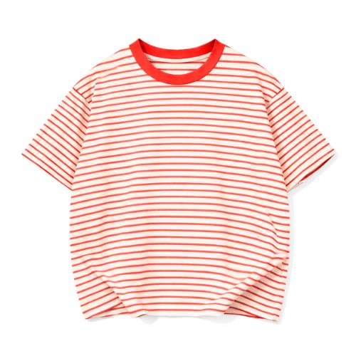 Γυναικείο T-shirt με κοραλί ρίγες και έντονη λαιμόκοψη, που προσθέτει ζωντάνια και φρεσκάδα στο look.